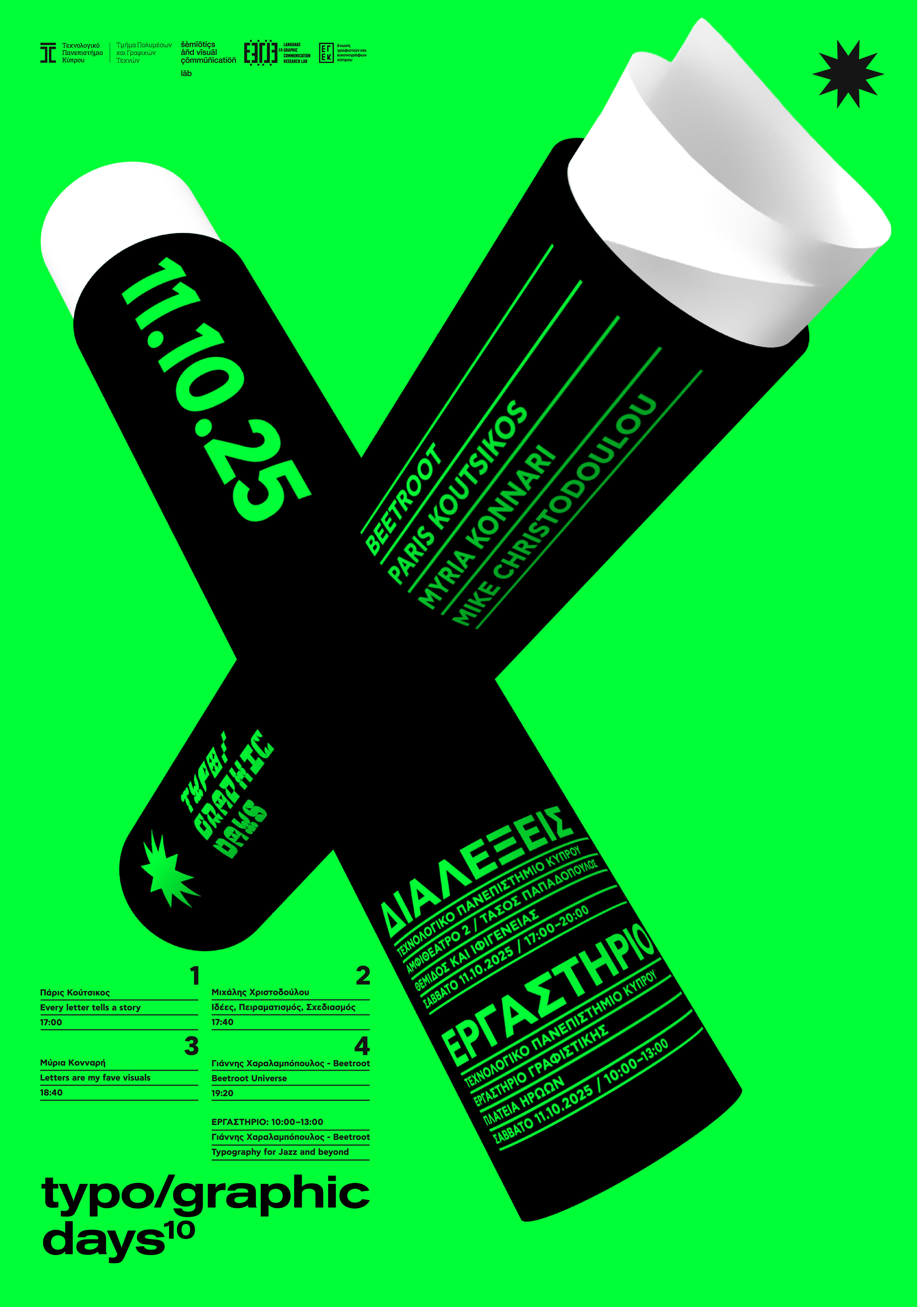 Οι «Τυπογραφικές Μέρες 2025» συμπληρώνουν 10 χρόνια γεμάτα έμπνευση και καινοτομία, γιορτάζουν την δημιουργικότητα στον κόσμο της τυπογραφίας και του γραφιστικού σχεδιασμού και ευελπιστούν να είναι η πιο δυναμική και συμμετοχική διοργάνωση μέχρι σήμερα.