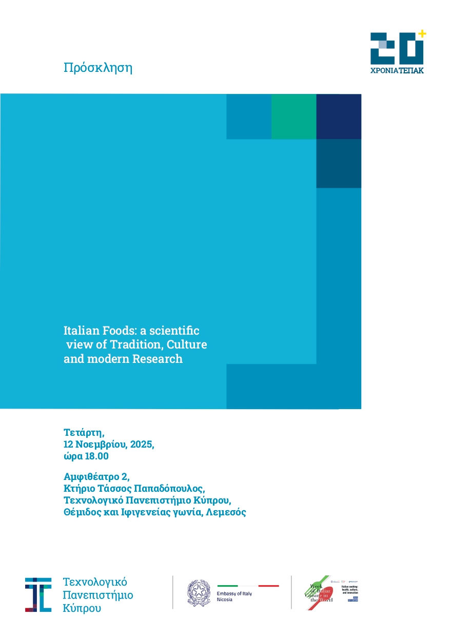 Η Πρεσβεία της Ιταλίας στην Κύπρο και το Τμήμα Γεωπονικών Επιστημών, Βιοτεχνολογίας και Επιστήμης Τροφίμων του Τεχνολογικού Πανεπιστημίου Κύπρου (ΤΕΠΑΚ) διοργανώνουν, στο πλαίσιο του εορτασμού της «Εβδομάδας Ιταλικής Κουζίνας στον Κόσμο», διάλεξη με τίτλο: