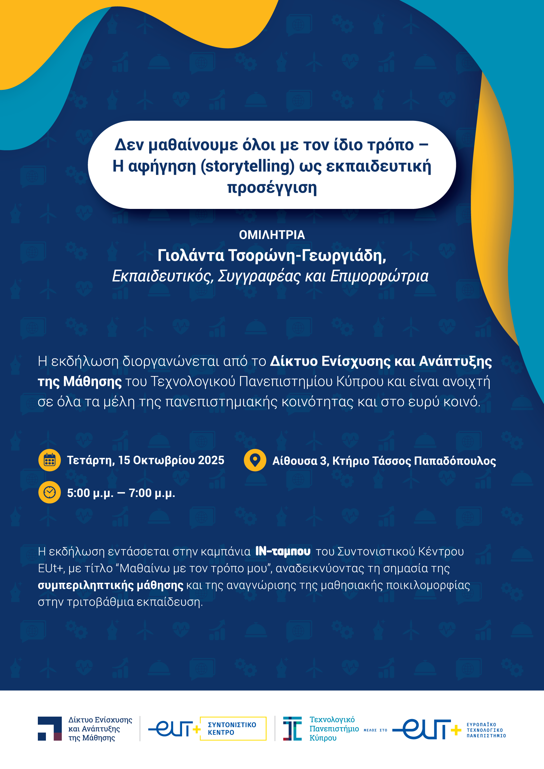 Το Δίκτυο Ενίσχυσης και Ανάπτυξης της Μάθησης του Τεχνολογικού Πανεπιστημίου Κύπρου και το Συντονιστικό Γραφείου του Ευρωπαϊκού Τεχνολογικού Πανεπιστημίου EUT+ διοργανώνει εκδήλωση με ομιλήτρια τη Γιολάντα Τσορώνη-Γεωργιάδη, εκπαιδευτικό, συγγραφέα και επιμορφώτρια, με θέμα τη δύναμη της αφήγησης ως εργαλείο μάθησης και επικοινωνίας.