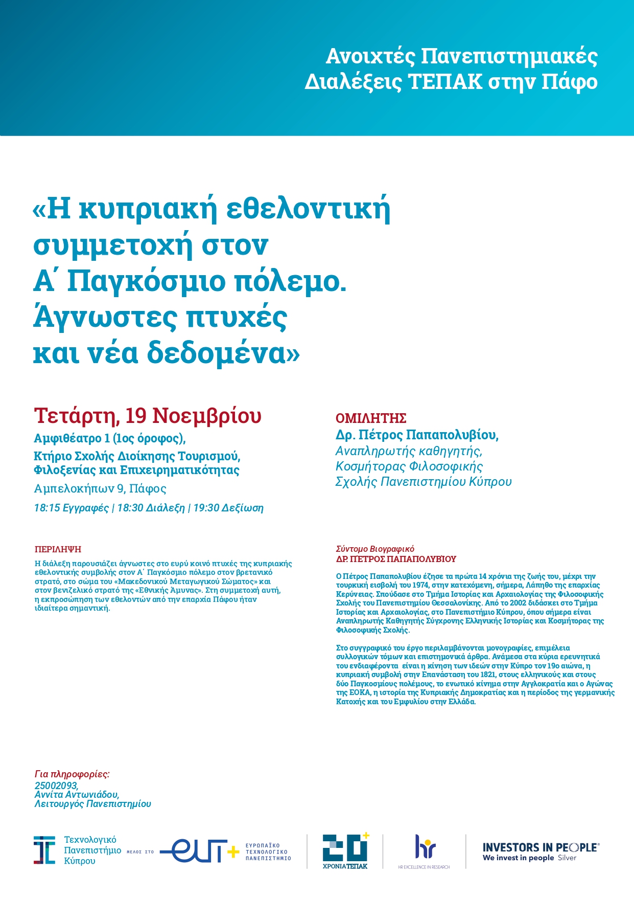 - Χώρος: Αμφιθέατρο 1 (1ος όροφος), Σχολή Διοίκησης Τουρισμού, Φιλοξενίας και Επιχειρηματικότητας, Αμπελοκήπων 9, Πάφος